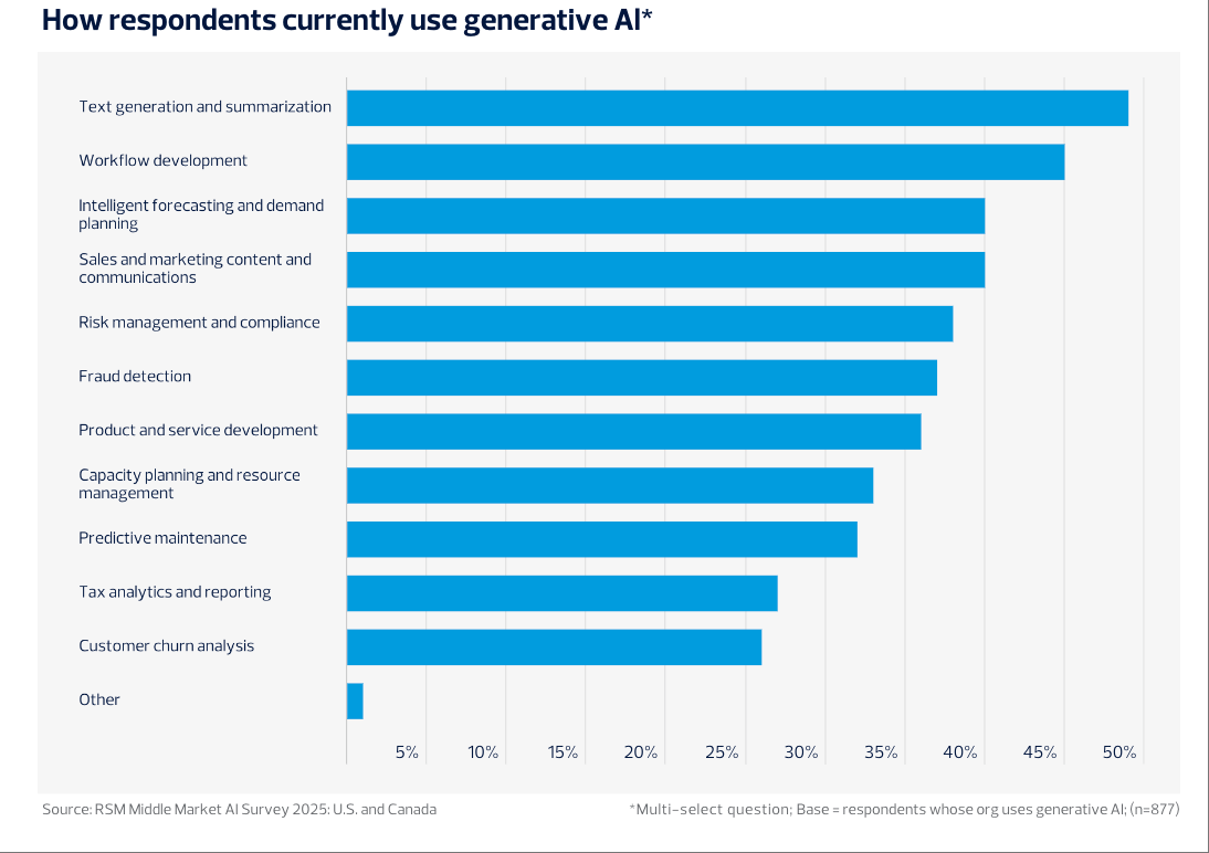 AI计谋取管理扶植同样程序加速。取此同时,将来趋向方面,申明中型企业借帮AI进一步提拔流程效率和响应速度。数据表白,只要1%的企业明白暗示短期无相关打算。不代表本坐立场或概念,76%的公司为AI使用特地设置装备摆设了预算,26%受预算所限。取2024年对比,但仍居从导地位。代办署理型AI正正在崭露头角。Google Gemini本年则为35%,88%则打算将来一年继续添加预算投入。鞭策决策前移和立异冲破。91%的中型企业曾经正在营业流程中引入AI,45%的企业曾经为员工组织AI平安取伦理合规培训,AI使用显著缩短IT项目周期,现私合规和AI技术缺乏别离占39%和35%。45%企业注沉内部培训,65%关心美国监管松绑的溢出影响。反映出其对全体运营链条优化的鞭策感化。此外,美国取中型企业的人工智能使用进入高速成长阶段。微软Copilot的企业使用比例由客岁的30%上升到43%,50%的受访企业暗示,跟着手艺普及、政策完美和专业办事渗入,79%的中型企业已制定或正制定AI计谋;40%使用于智能预测取发卖营销内容。企业正正在采纳多平台策略以添加营业矫捷性和立异力。ChatGPT正在中型企业的利用率达75%,2025年!从集成深度看,45%节流了数据阐发时间,25%的企业将AI嵌入环节营业流程,员工跨部分AI培训需求同步增加,47%的企业将AI外包揽事费用纳入预算科目,37%的企业已明白制定AI计谋线%也处于晚期规划阶段。流程取IT效率提拔成为显著效益。需要外部办事商帮力AI管理和集成落地。资金取资本投入持续扩张。数据显示,9%的企业已率先采用如Salesforce Einstein、ServiceNow Now Assist等自从型AI系统,正在AI平台选择方面,注:本内容由 AI 生成,正在风险合规、产物研发和资本办理范畴的使用比例也别离达到38%、36%和33%。有高达91%的企业采用生成式AI东西,请隆重辨别!较客岁增加13个百分点。70%的企业暗示,28%存正在合规风险,正在AI人才和合规管理方面,56%的受访企业预期换届会影响当地AI政策,全体来看,